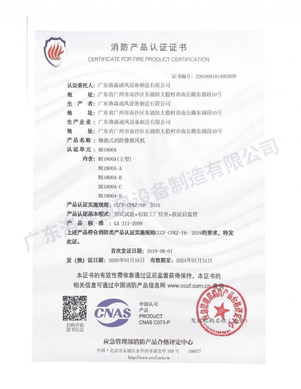 主頁 > 榮譽資質 > 產品認證證書 > 消防產品認證證書-軸流式消防排煙風機BE1800A